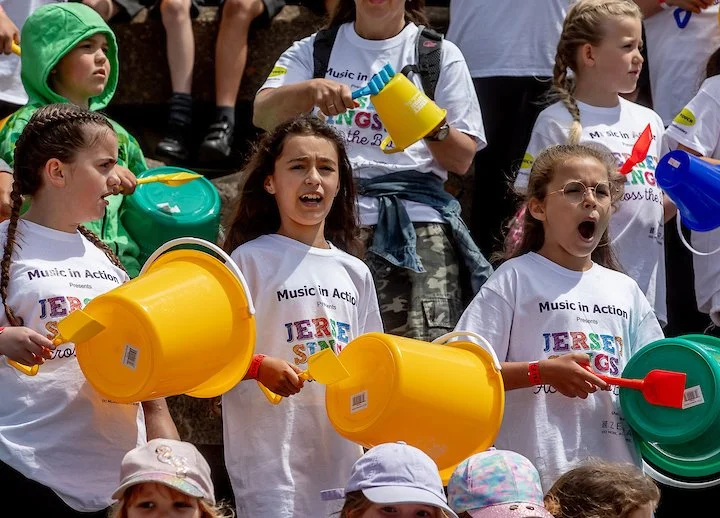 On 7th-9th February 2024, there will be workshops in schools for a “Bucket and Spade” orchestra with Janet Fulton. Janet is renowned in the UK as an animateur and leader at mass community events. She will be joined by Director of Percusion at the Royal Northern College of Music - Andrea Vogler with more workshops in June 2024 for schools. Five choir pieces will be performed at Jersey Sings Across the Bay and two more Radio Gaga and World in Union with solo singers.